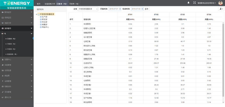 能耗分析包括企業(yè)用能分析、部門綜合能耗、設(shè)備用能分析和電量指標綜合分析這四類,將企業(yè)中各部門及各監(jiān)測點實際用能情況,通過不同的分析方式展現(xiàn)出來。